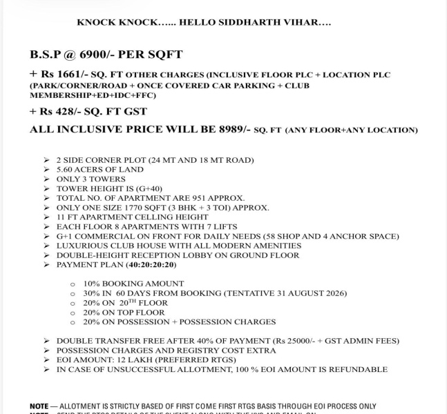Rs 1661/- SQ. FT OTHER CHARGES (INCLUSIVE FLOOR PLC + LOCATION PLC (PARK/CORNER/ROAD + ONCE COVERED CAR PARKING + CLUB MEMBERSHIP+ED+IDC+FFC))
